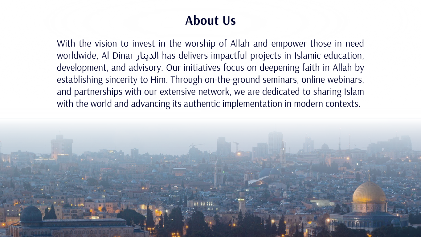 With over a decade of studying and teaching Islam—and witnessing the challenges facing future generations—Al Dinar was established to introduce Allah to hearts worldwide and support those in need. The name "Al Dinar" signifies wealth spent in His Path, as an investment in His worship that brings you rewarding returns. It is also to dignify the recipient as the name 'Al Dinar' is associated with honour.